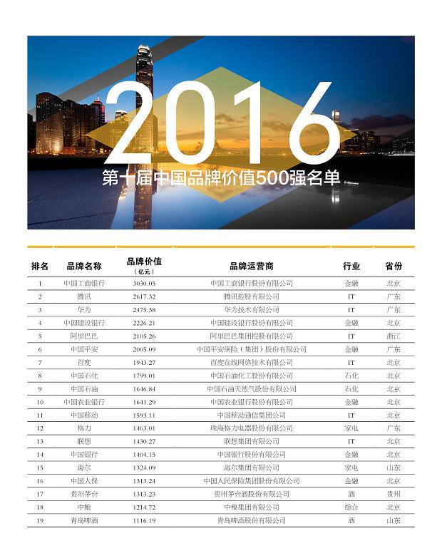 第十屆中國品牌價(jià)值500強(qiáng)排名第1名的是中國工商銀行,品牌價(jià)值為3030億元,比2015年的2819億元增值211億元。中國工商銀行是第一個(gè)品牌價(jià)值跨過3000億元的企業(yè),創(chuàng)下了一個(gè)新的歷史紀(jì)錄。其他排在前10名的品牌價(jià)值分別如下:第2名騰訊2617億元;第3名華為2475億元;第4名中國建設(shè)銀行2226億元;第5名阿里巴巴2105億元;第6名中國平安2005億元;第7名百度1943億元;第8名中國石化1799億元;第9名中國石油1646億元;第10名中國農(nóng)業(yè)銀行1641億元。前10名的品牌價(jià)值總值超過2萬億元,平均每個(gè)上榜品牌的價(jià)值為2149億元。
