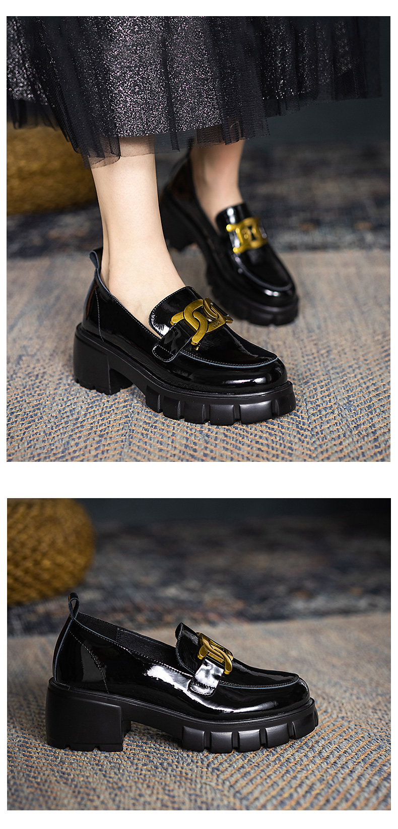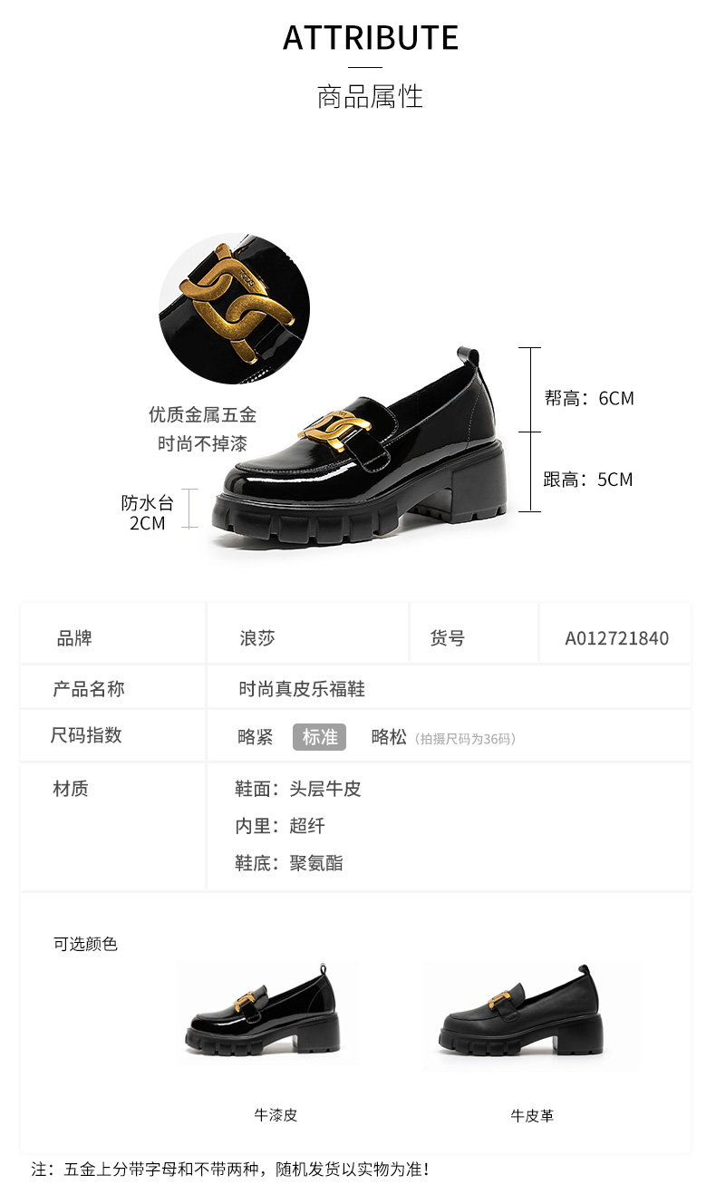 浪莎馬銜扣樂福鞋女英倫2021黑色真皮粗跟松糕一腳蹬厚底中跟單鞋