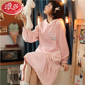 浪莎冬季法蘭絨睡裙女冬長袖可愛卡通韓版帶帽睡裙家居服可外穿
