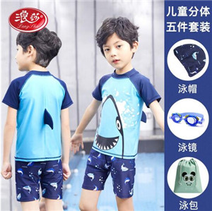 浪莎(LangSha)兒童泳衣男童分體寶寶中大童小孩嬰幼兒學(xué)生游泳褲泳裝套裝 藍(lán)鯊魚(yú)五件套 4XL